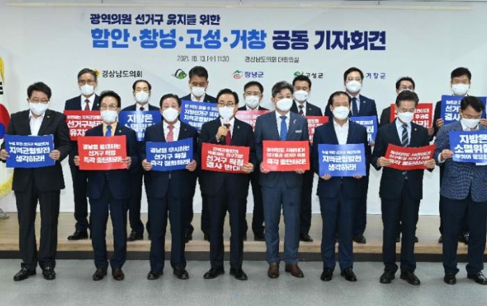 광역의원 선거구 유지 총력전, 경남도 4개 군 공동 긴급 기자회견= 함안․창녕․고성․거창군수․도의원 경상남도의회에서 한 목소리 내 = 경남도내 광역선거구 축소위기지역인 함안․창녕․고성․거창 4개 군이 2022년 치러질 지방선거의 선거구 축소에 반대하기 위해 13일 경