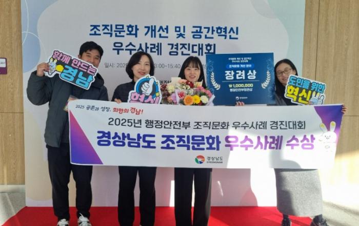 경남도, 조직문화 혁신 성과로 경진대회서 ‘장려상’ 수상 - 5일, 청주서 행안부 주관 ‘조직문화 개선 우수사례 경진대회’ 개최- ‘함께 소통‧성장’ 조직문화 개선 과제 추진 노력 인정받아- 직원 워케이션‧인계인수 표준화‧스피크잡스‧혁신모임 등 사례 소개 경상남도(도지