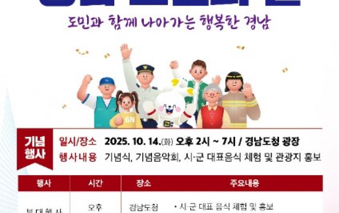 10월 14일, 경남도민과 함께하는 특별한 하루도청으로 여러분을 초대합니다!- 도민이 주인공이 되고 온 가족이 즐기는 참여형 축제- 제42회 도민의 날, 기념식과 음악회 등 다채로운 행사 진행 경상남도(도지사 박완수)는 10월 14일 오후 2시부터 7시까지 경남도청 광