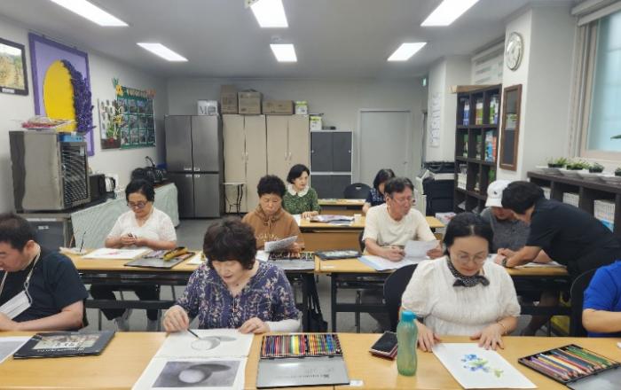 경남조은장애인평생학교 학생들은 1교시 미술수업 시간에 지난시간 동백꽃 스케치를 하고 색칠을 못한 분들이 많으셔서 색칠을 해보는 시간을 가져보았습니다. 색연필을 사용하는 방법으로 연한색부터 진한색으로 색칠을 해나갑니다. 같은 색상계열의 색연필을 다양하게 섞어 색을 넣어주