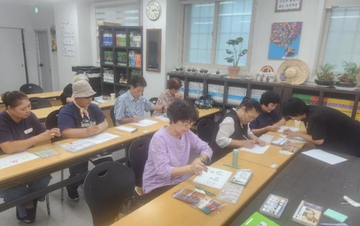 경남조은장애인평생학교 학생들은 1교시 수학 수업 후 2교시 미술심리치료 시간에 내 이름으로 나를 표현해보는 시간을 가져보았습니다. 각자 용지에 내 이름을 그리고 면봉으로 콕콕 찍으면서 이름을 꾸며보았습니다. 한 자 한 자 내가 좋아하는 색깔로 꾸미다 보니 어느새 다들