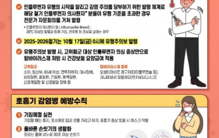 경남도, 인플루엔자 유행 주의 안내 - 인플루엔자 의사환자 지속적인 증가로 백신접종 및 주의 당부- 10월 22일부터 65세 이상 어르신 접종 본격 시작- 손 씻기 및 기침 예절 등 개인위생수칙 준수 경상남도(도지사 박완수)는 지난 17일 질병관리청에서 인플루엔자(독감