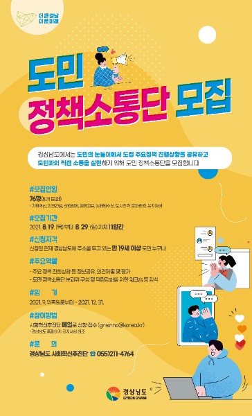 자격 요건은 도내 주소지를 두고 있는 만 19세 이상 경남도민이라면 누구나 지원할 수 있으며, 경남도 누리집 공지사항 ‘도민 정책소통단 모집’에서 신청서식을 내려받아 29일까지 사회혁신추진단 메일로 신청·접수하면 된다.