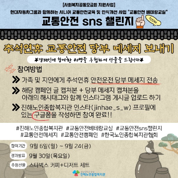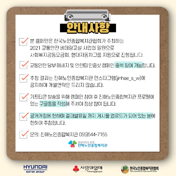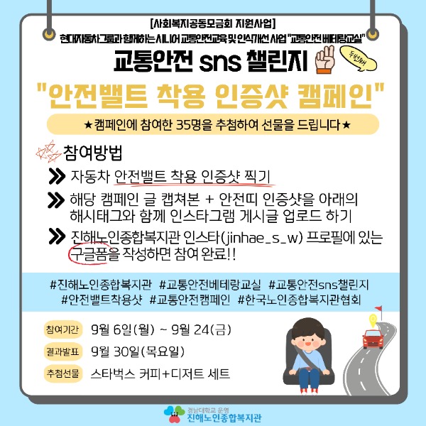 진해노인종합복지관에서 진행중인 지역사회 내 교통사고 예방을 위한 [교통안전sns챌린지]에 많은 참여 바랍니다.