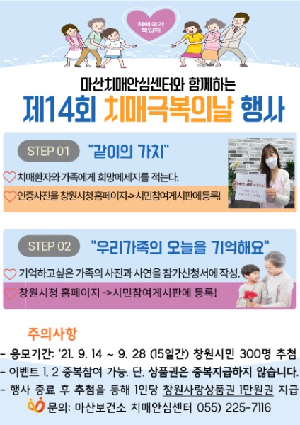 - 치매환자와 가족에게 전하는 응원과 희망메시지 등을 적은 인증사진을 창원시청 홈페이지 "시민참여 → 모집신청접수" 게시판에 등록