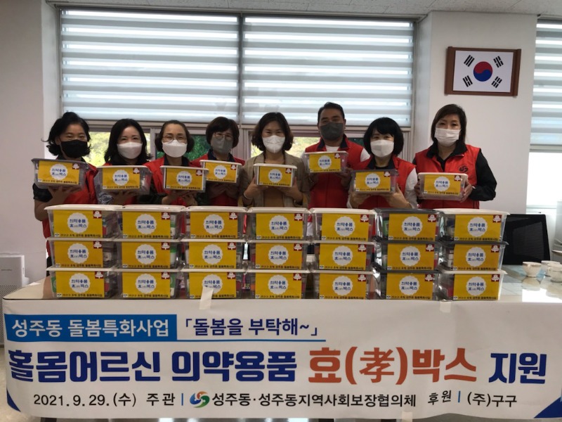 최영숙 성주동장은 “어르신들의 경우 가을, 겨울 환절기에 면역력 등이 떨어져 쉽게 질병 등에 노출되기 쉽다. 집에서 쉽게 쓸 수 있는 비상약과 파스 등을 지원하여 신체 건강관리에 도움을 주고자 지원하게 되었으며, 물품을 지원할 수 있게 도와준 ㈜구구와 자원봉사활동을 펼쳐 준 지역사회보장협의체 위원들께도 감사드린다.”고 전했다.