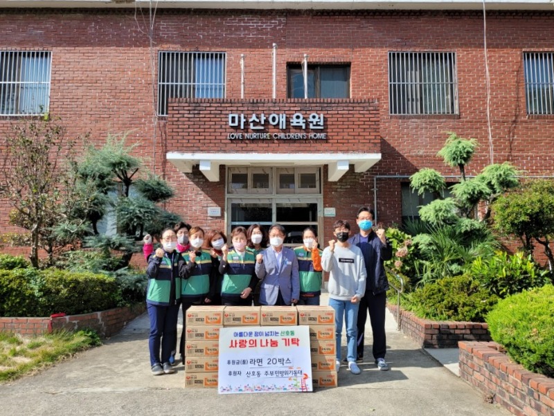 산호동행정복지센터(동장 이만덕)에서는 지난 26일 산호동 주부민방위기동대에서 마산애육원에 라면 20박스를 기탁했다고 밝혔다.