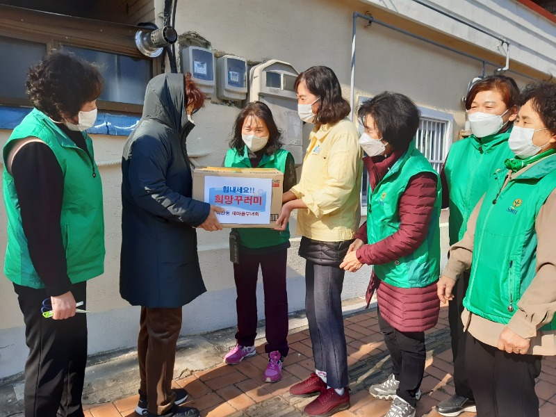 박미숙 새마을 부녀회장은 부녀회원들의 뜻을 모은 경비로 라면 등 식료품 및 생필품을 구입하여 저소득층 및 장애인 등 20가구에 방문 직접 전달하였으며, “코로나19로 더욱 힘든 시기에 동절기를 조금이나마 따뜻하게 지내시라고 약소하나마 물품을 전달하니 조금 더 힘을 낼 수 있었으면 좋겠다”고 하였다.