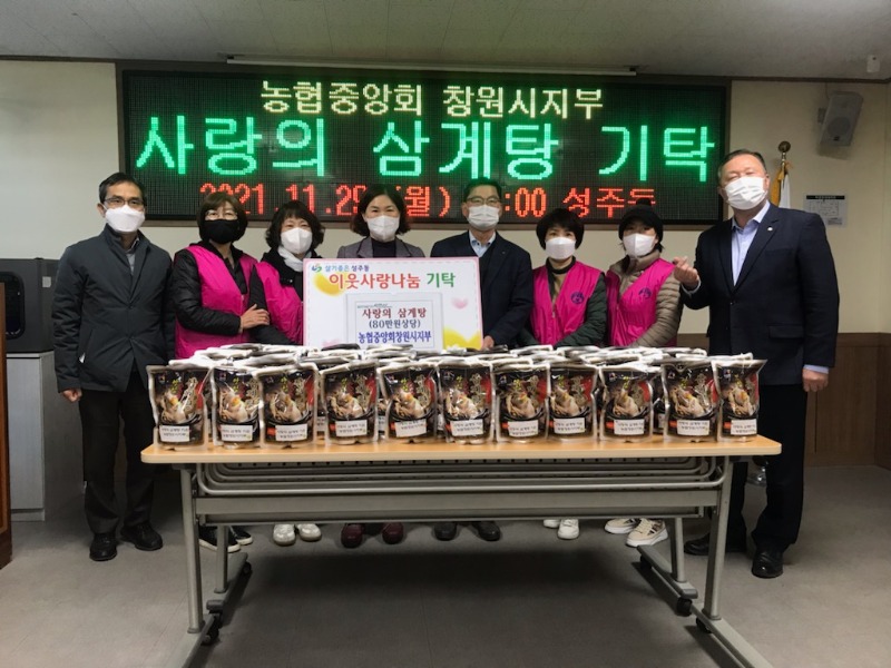 농협중앙회창원시지부 박성호 회장은 “날씨가 추워지고 코로나19가 장기화 되어 모두가 힘든 시기로 지역내 어려운 이웃들을 돌아보는 계기로 사랑의 삼계탕을 기탁하게 되었고, 따뜻한 마음이 전해졌으면 좋겠다.”고 말했다.