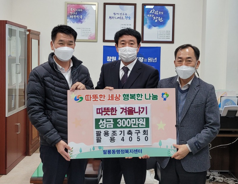 창원시 의창구 팔룡동 팔용조기축구회(회장 원성희)와 팔용4050(회장 박희돈)은 30일 어려운 이웃들에게 전해달라며 성금 300만원을 팔룡동 행정복지센터에 기탁했다.