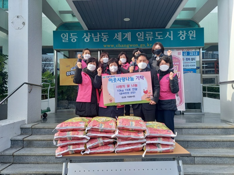 창원시 성산구 상남동자원봉사회(회장 이윤숙)는 12월3일(금) 연말을 맞아 상남동 행정복지센터(동장 윤정근)에서 ‘사랑의 쌀 나눔’ 백미 10kg 15포(금46만원 상당)를 기탁했다.