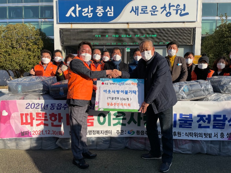 창원시 의창구 동읍 주민자치회(회장 이종삼)는 12월 30일 강신오 동읍장, 김장하 시의원을 비롯한 주민자치위원들과 함께 동읍 행정복지센터에서 ‘2021년 연말맞이 이웃사랑’ 이불 전달식을 열었다.
