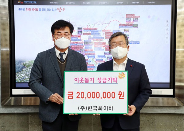 ㈜한국화이바는 2020년 12월에도 연말연시 이웃돕기 성금으로 2000만 원을 맡겼으며, 지난해 설 명절을 맞아 밀양시 장애인복지관에 생필품 110박스를 맡긴 바가 있다.