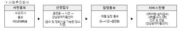 경남광역자활센터가 사업을 총괄해 6개 지역자활센터에서 권역별로 나누어 주 5회 시군 주민센터, 마을회관 등 신청한 장소로 찾아가서 이불 등 대형빨래 서비스를 지원하고 있다.