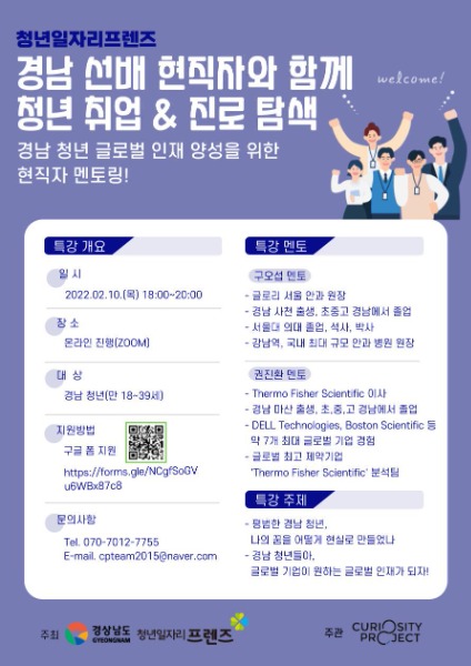오는 2월 10일(목) 오후 6시에 비대면 화상회의 솔루션으로 열리는 이번 특강은 경남 출신 선배 멘토를 초청하여 각 분야별 멘토들의 꿈과 성공스토리를 경남의 후배 청년에게 생생하게 전달할 예정이다.