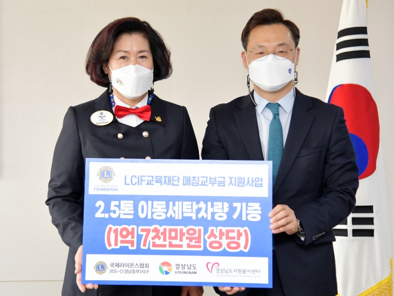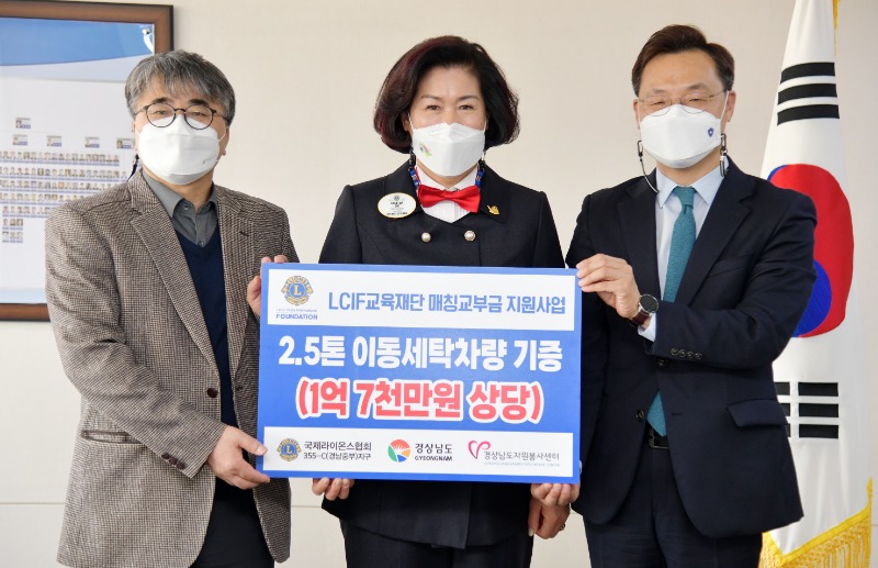국제라이온스협회 경남중부지구가 기증하는 이동세탁차량은 내부에 세탁기, 건조기를 설치하고 3월에 경상남도자원봉사센터에 전달된다. 이동세탁차량은 재난지역 구호활동, 취약계층 세탁지원 등에 활용될 예정이다.