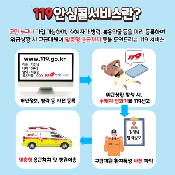 119안전신고센터에 등록된 가입자 정보를 확인해 환자 상태에 맞게 신속한 응급 처치가 가능한 서비스로, 도민이면 누구나 등록할 수 있다.