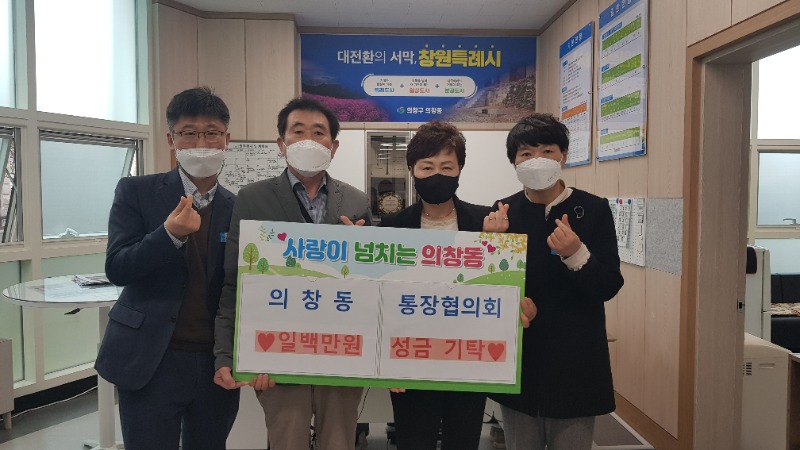 창원시 의창구 의창동통장협의회(회장 권혜영)는 30일 관내 취약 계층을 위해 써 달라며 성금 100만원을 의창동행복나눔법인에 기탁하였다.