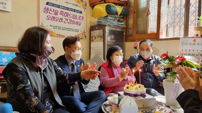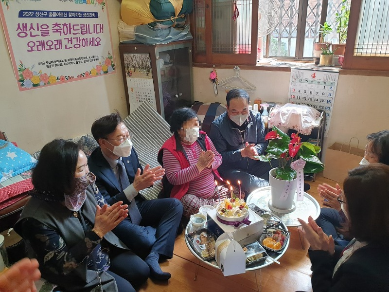 창원시 성산구(구청장 안병오)는 4월 6일 관내 홀몸어르신 8세대를 찾아 2022년 첫 번째 홀몸어르신 찾아가는 생신잔치를 진행했다.