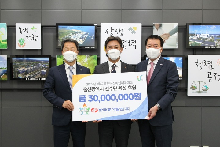 [울산=뉴시스]구미현 기자 = 한국동서발전(주)는 26일 울산 중구 동서발전 본사에서 제42회 전국장애인체육대회의 성공적 개최를 기원하며 울산장애인체육회에 후원금 3000만원을 전달했다.