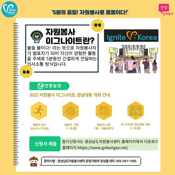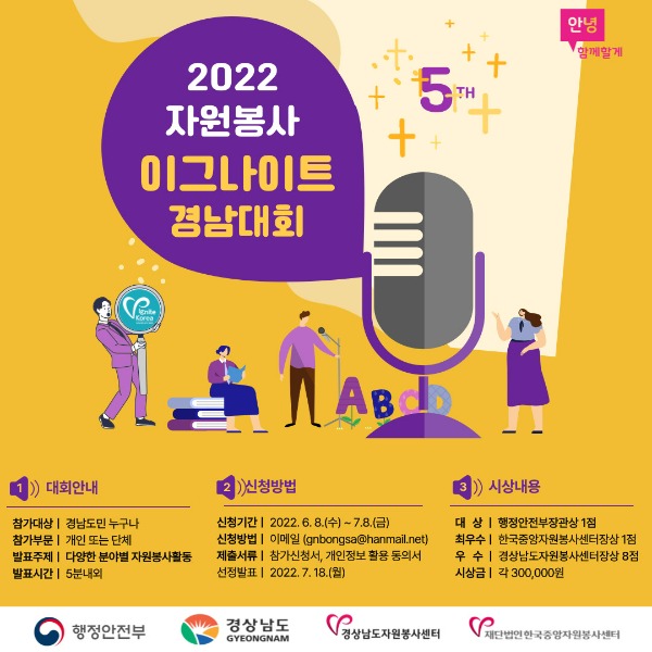 경상남도자원봉사센터는 9월에 개최되는 ‘2022 자원봉사 이그나이트 경남대회’에 참여할 발표자를 2022. 6. 8.(수) ~ 7. 8.(금)까지 모집한다.