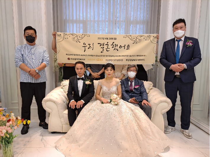 이번 결혼식은 부산·경남웨딩지원센터와 결혼업체 브라이덜수의 지원으로 진행됐다. 김호배 마산장애인복지관장이 주례를 맡았다.
