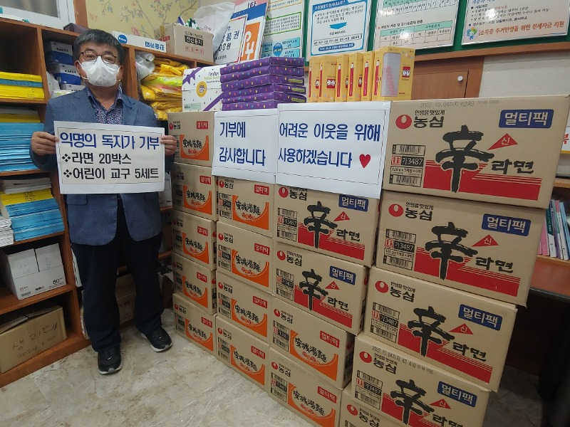 익명의 기부자는 지난 5월에도 라면 12박스를 기부한 바 있으며 “어려움을 겪고 있는 가정에 조금이라도 힘을 드리고 보탬이 되기를 바란다.”고 말하며 행정복지센터 입구에 라면과 어린이 교구세트를 놓아두고 자리를 떴다. 기부 물품은 익명의 기부자 뜻에 따라 취약계층 25세대에 골고루 전달할 예정이다.