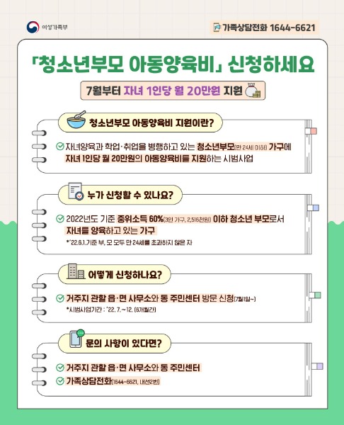 청소년부모 아동양육비는 부모가 모두 만24세 이하(97년 6월 1일 이후 출생자)로서 실제 자녀를 양육하고 있으면 자녀 1명당 20만원씩 지원되는 것이다. 소득기준은 부와 모의 2021년 월평균소득 합산했을 때 2022년 기준중위소득 60%이하(3인 251만원)에 해당하면 된다.