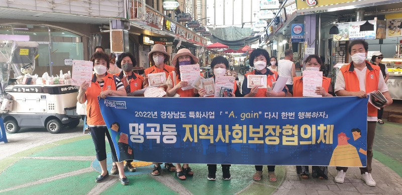 명곡동 지역사회보장협의체는 올해 “A. gain 다시한번 행복하자” 라는 제목으로 경상남도 공모 특화사업에 선정된 바 있으며, 이중 ‘생명사랑지킴이 사업’으로 홍보 캠페인은 물론 통장, 자원봉사회 등 각종 단체와 함께 복지사각지대 발굴에 적극적으로 나서고 있다.