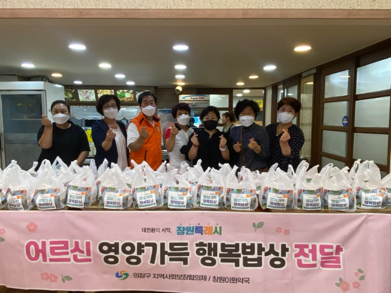 영양가득 행복밥상 지원사업은 창원이화약국(대표 김명숙)에서 후원하는 사업으로 의창구 읍면동 지역사회보장협의체(위원장 황금자)에서 홀로 지내시는 어르신 50명을 찾아가 관내 식당 봉담정에서 준비한 영양식을 전달하고 안부를 확인하는 지역공동체 돌봄사업이다.