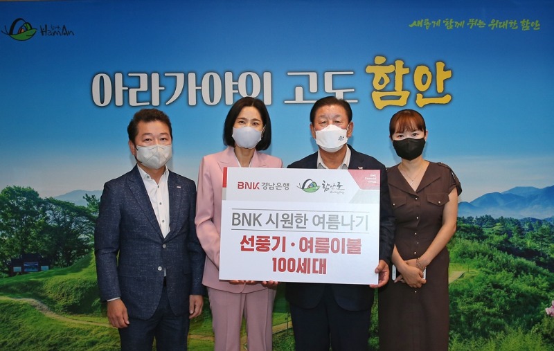 BNK경남은행 함안지점 사랑나눔재단은 26일 어려운 이웃을 돕기 위한 선풍기 50대, 여름이불 50채(300만 원 상당)를 함안군에 기탁했다.