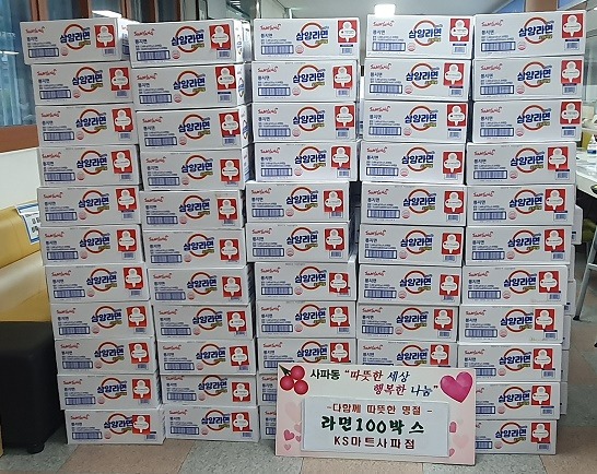 이날 기탁된 라면은 기초수급자, 장애인가정 등 100세대에 전달될 예정이며, KS마트 사파점은 설과 추석 명절마다 어려운 이웃을 위해 따뜻함을 전하고자 4년째 꾸준히 라면을 기탁하고 있다.