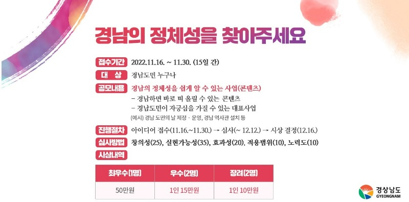 김상원 경남도 행정혁신과장은 “경남의 정체성 강화를 위해 도민들의 다양한 아이디어가 발굴되기를 기대하며, 채택된 아이디어는 경남도 정체성 강화 사업에 적극 반영할 계획”이라며 도민들의 적극적인 참여를 요청한다고 밝혔다.