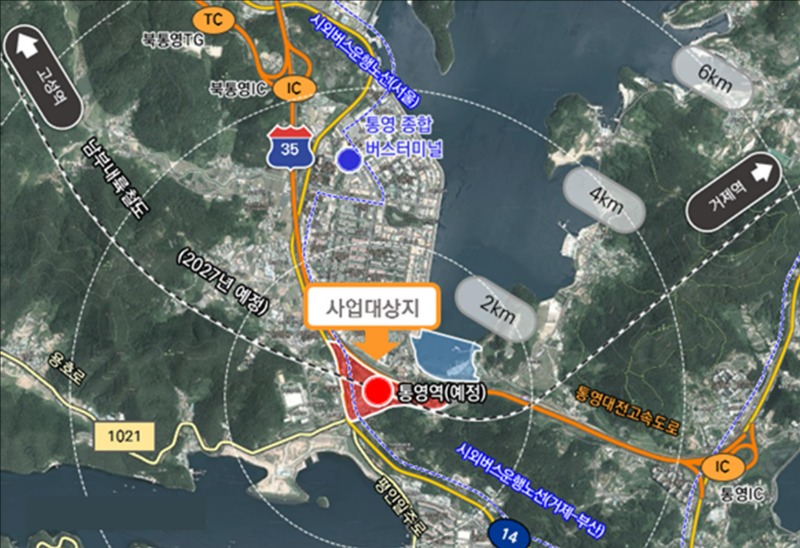 ‘KTX통영역세권 개발사업’은 남부내륙철도 개통과 동시에 역세권개발을 완료하는 것을 목표로 통영시 용남면, 광도면 일원 30만 1,311㎡(약 9만 평) 규모의 부지에 역세권 및 배후단지를 조성하고, 그 배후단지에는 복합환승센터 및 웰니스 지역의료 거점, 해양관광(마리나)등 주상복합시설을 조성할 계획이다.
