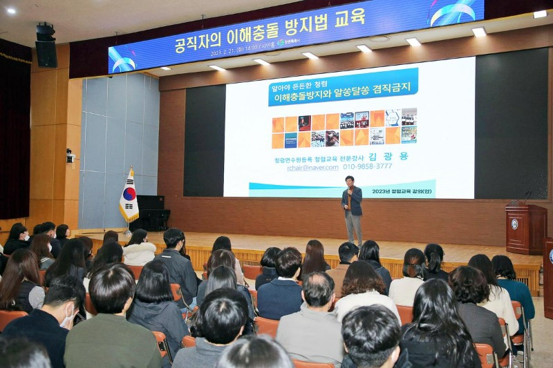 시는 교육 강사로 국민권익위원회 청렴연수원 전문강사이자 부산흥사단 투명사회운동본부 공동대표인 김광용 강사를 초청했다.
