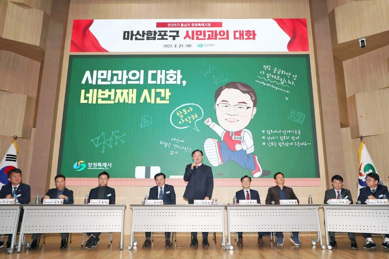 이날 오전 10시 마산합포구청 대회의실에서 진행된 시민과의 대화는 홍남표 창원특례시장, 김선민 마산합포구청장, 각 실·국장이 시민들을 위해 자리하였고, 400여 명의 시민이 현장을 가득 메워 식을 줄 모르는 시민과의 소통 열기를 이어갔다. 또한, 현장에 준비된 ‘시민의 소리함’에는 홍 시장에게 전하는 메시지를 적는 시민들로 붐비기도 하였다.