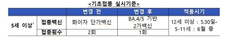 다만, 5-11세의 2가백신은 아직 도입되지 않은 상황으로, 6월 중 도입 즉시 실시기준에 반영해 시행할 예정이다.