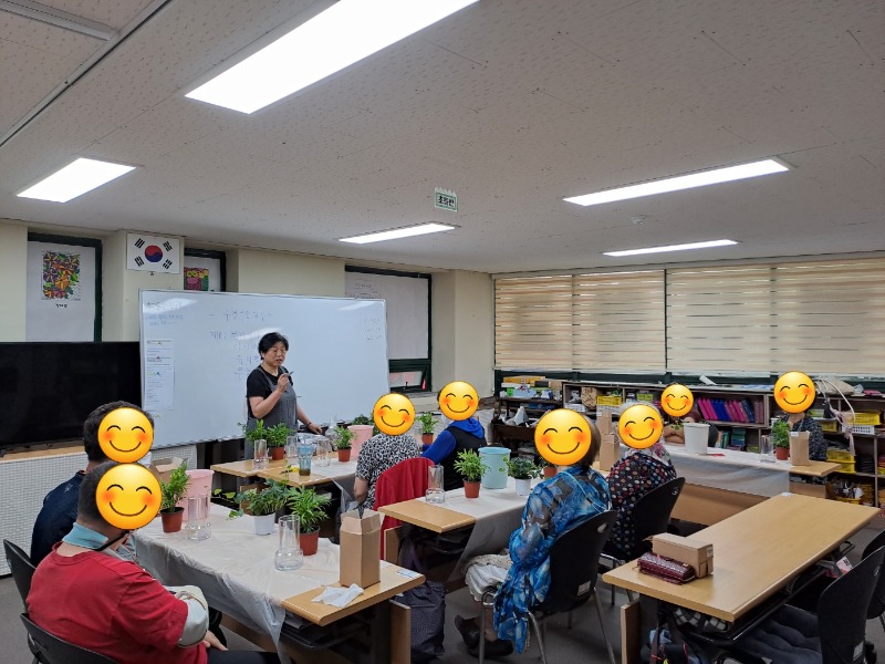 경남조은장애인평생학교 1반 학생들은 1교시에 명화 그림 퍼즐 오려 맞추기를 한 후, 2교시 프로그램 토탈 공예 시간에 원예 수업으로 수경 식물 심기를 해 보았습니다.