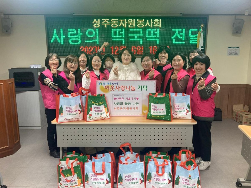 오늘 기탁한 물품들은 성주동 새마을부녀회가 불우이웃들을 위하여 새벽부터 정성껏 준비한 선물들로, 관내 저소득층 42세대에게 떡국떡 한 상자씩 전달하여 연말 성주동의 추운 겨울을 훈훈하게 만들었다.