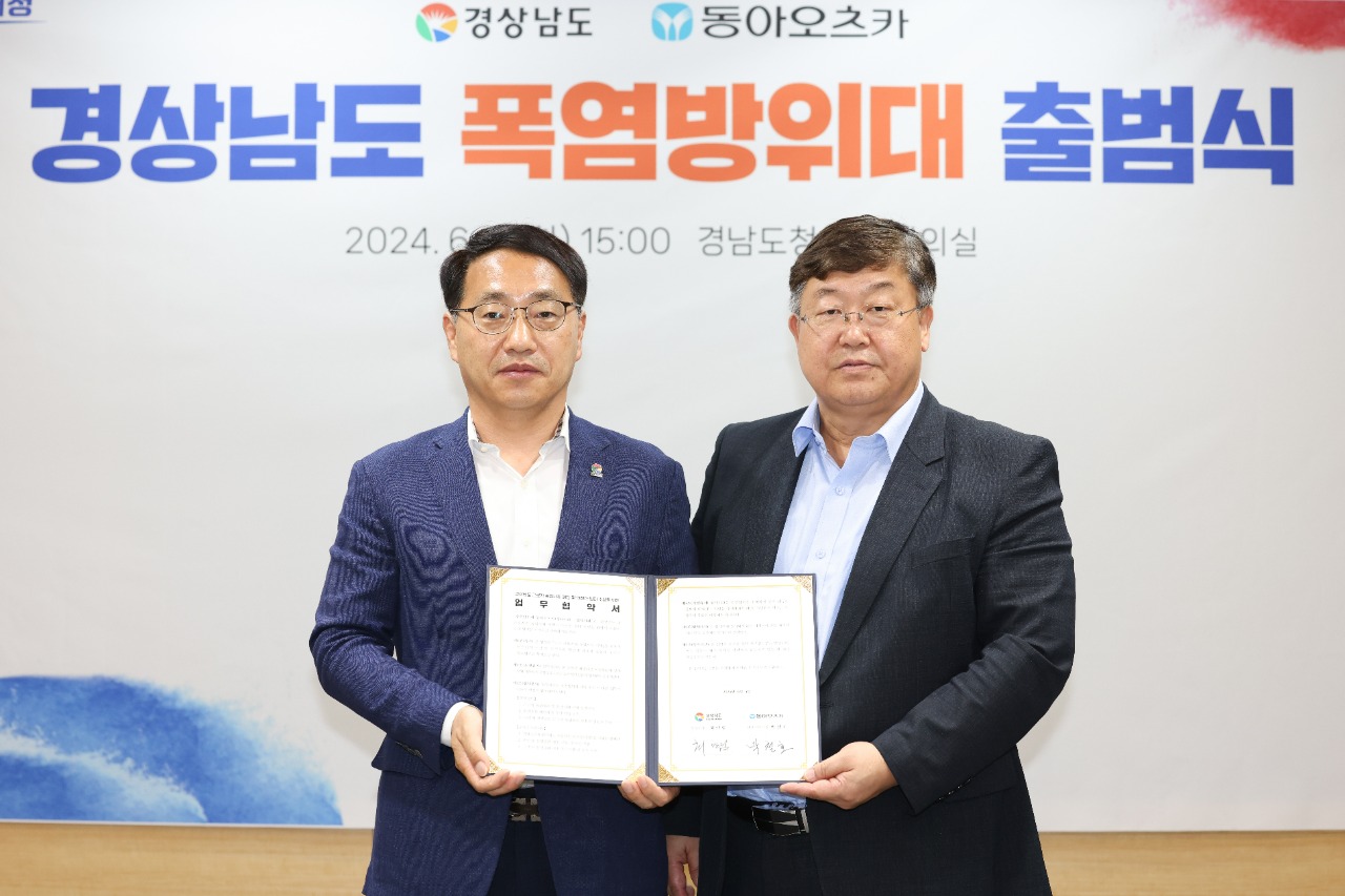 경남도는 4일 오후 도정회의실에서 폭염 재해 예방을 위해 동아오츠카와 업무협약을 체결하고, ‘경상남도 폭염방위대’ 출범식을 개최했다고 밝혔다. 경남도는 동아오츠카와 함께 근로자의 산재 예방과 안전문화 캠페인 모범사례를 만들고 이를 확산하기 위해 광역자치단체 최초로 동아오츠카와 협약을 체결하게 된 것이다.