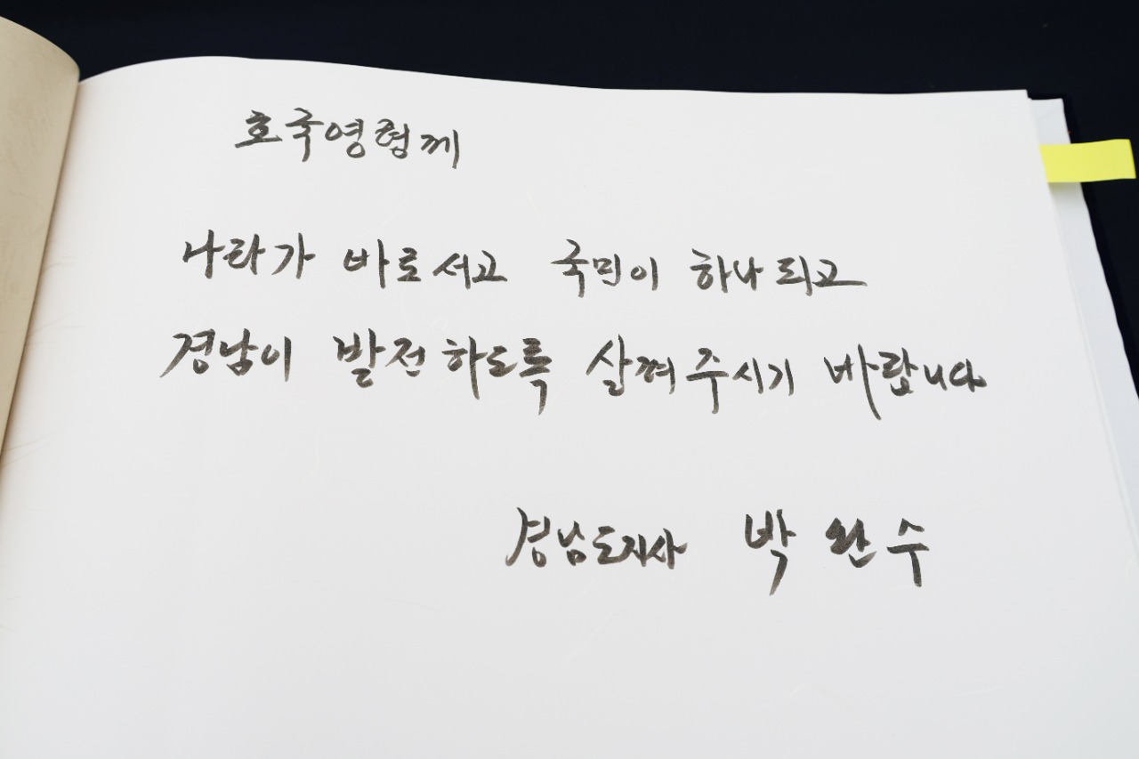 박완수 경상남도지사는 ‘나라가 바로 서고, 국민이 하나 되고, 경남이 발전하도록 살펴주시기 바랍니다’라고 호국영령에 대한 마음을 담아 방명록에 남겼다.