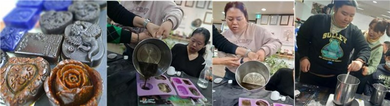 발달장애인들이 비누를 만들기 위해 비누베이스를 깍뚝썰기 한후 용기에 담아 녹인다.