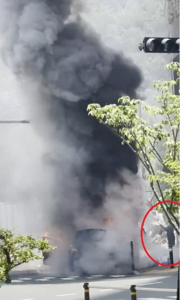 현장에는 차량 전면부에서 검은 연기가 자욱하게 피어올랐고, 주변 상인들이 소화기를 들고 나왔으나 강한 화재로 인해 쉽게 접근하지 못하는 상황이었다.
