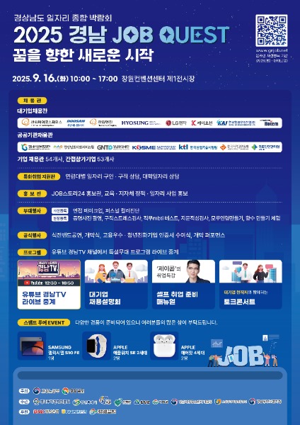 2025년 경남 일자리 종합박람회:JOB QUEST는 오는 16일 10시부터 17시까지 창원컨벤션센터 제1전시장에서 개최된다.