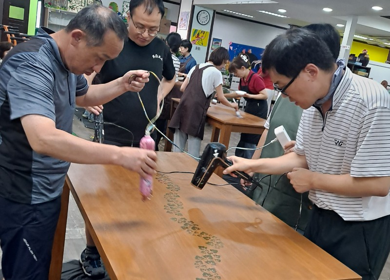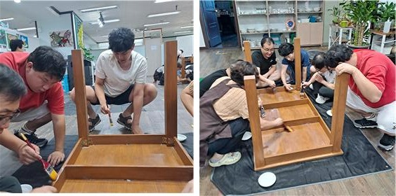 발달장애인 이용자들이 조립된 책상에 사포로 문지르고 색을 칠한 후 말리기를 반복하며