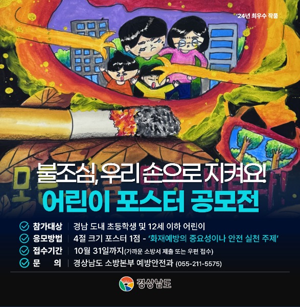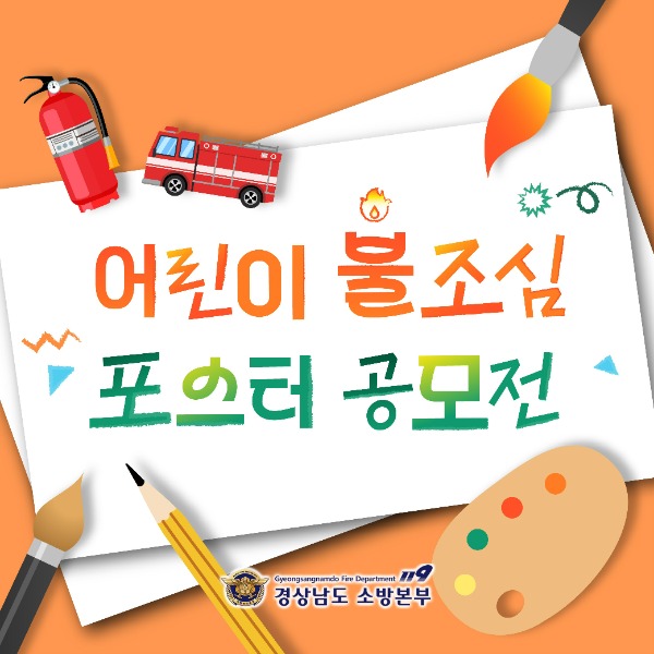 경상남도 소방본부(본부장 이동원)는 제78회 불조심 강조의 달을 맞아 오는 10월 31일까지 도내 어린이를 대상으로 ‘어린이 불조심 포스터 그리기 공모전’을 개최한다고 밝혔다.