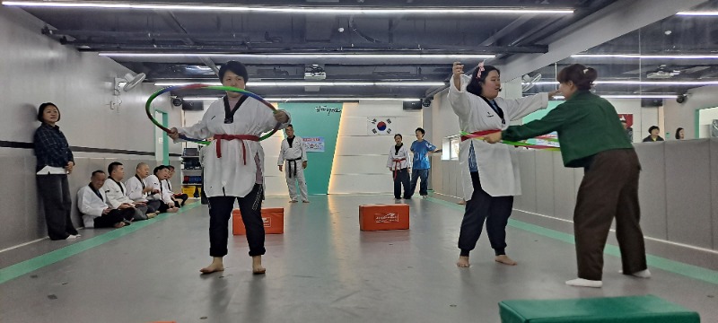 도장을 힘차게 달려 훌라우프를 돌리며 장애물경기를 한다.