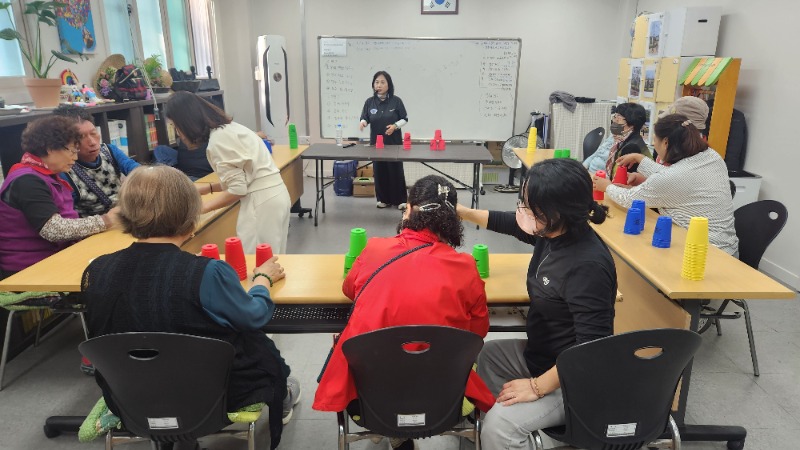 경남조은장애인평생학교 학생들은 1교시 영어 수업 후 2교시 컵타/스포츠스태킹 시간에 응원박수를 치며 손스팟을 해보고 아리랑 목동 노래에 맞춰 컵타를 해봅니다. 이번 시간에는 단체게임을 해보았는데 컵을 한줄로 길게 연결한 다음 기찻길위에서 누가 빨리 끝까지 도착하는지 흥미진진한 게임을 해보았습니다. 각 팀별로 응원구호를 정하고 열심히 게임에 임하는 학생들~ 마무리체조로는 신사랑 고개 노래에 맞춰 체조해봅니다. 즐거운 하루였습니다.