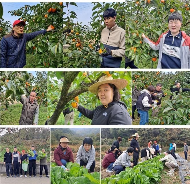 뜨레봄의 발달장애인들은 과수원에서 조심스럽게 감을 따며 밭에서는 배추가 더욱더 풍성히 잘 자라도록 배추를 잡고 끈으로 묶는다.