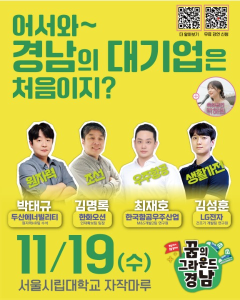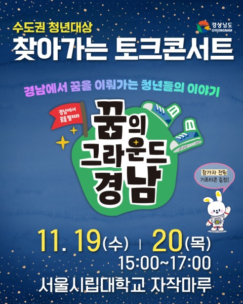 경남도는 19일부터 20일까지 서울시립대 자작마루에서 수도권 청년 대상 「꿈의 그라운드 경남」 찾아가는 토크 콘서트를 개최한다고 밝혔다.